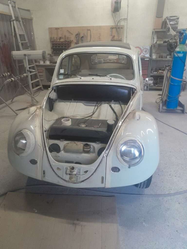 Le moteur de cette coccinelle a été déposé pour un problème d’embrayage.