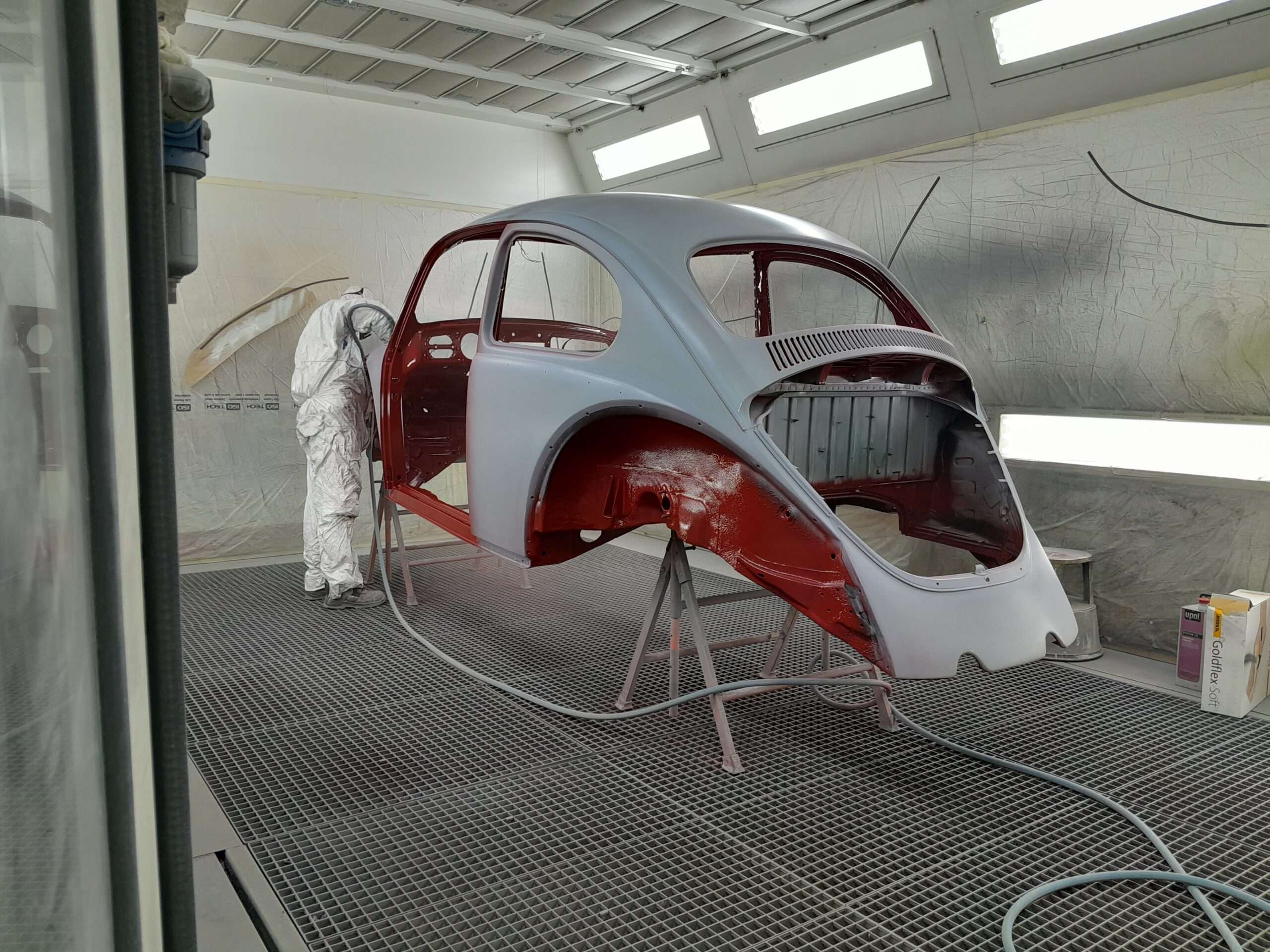 Retour en cabine pour la caisse de 1300. Les blaxon sont posés, les joints effectués. Place à la peinture.