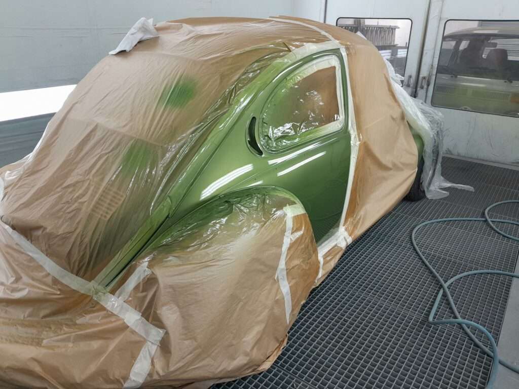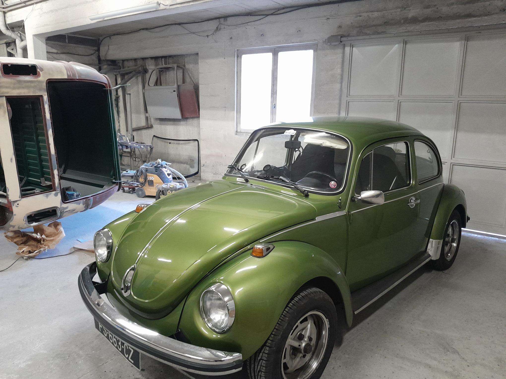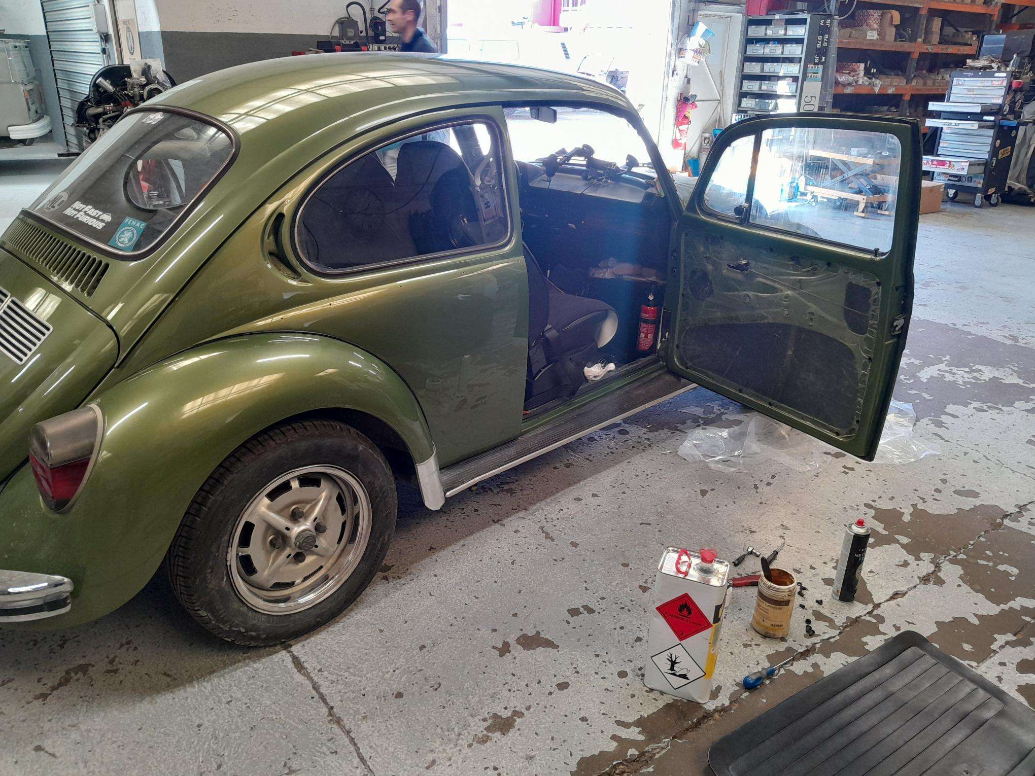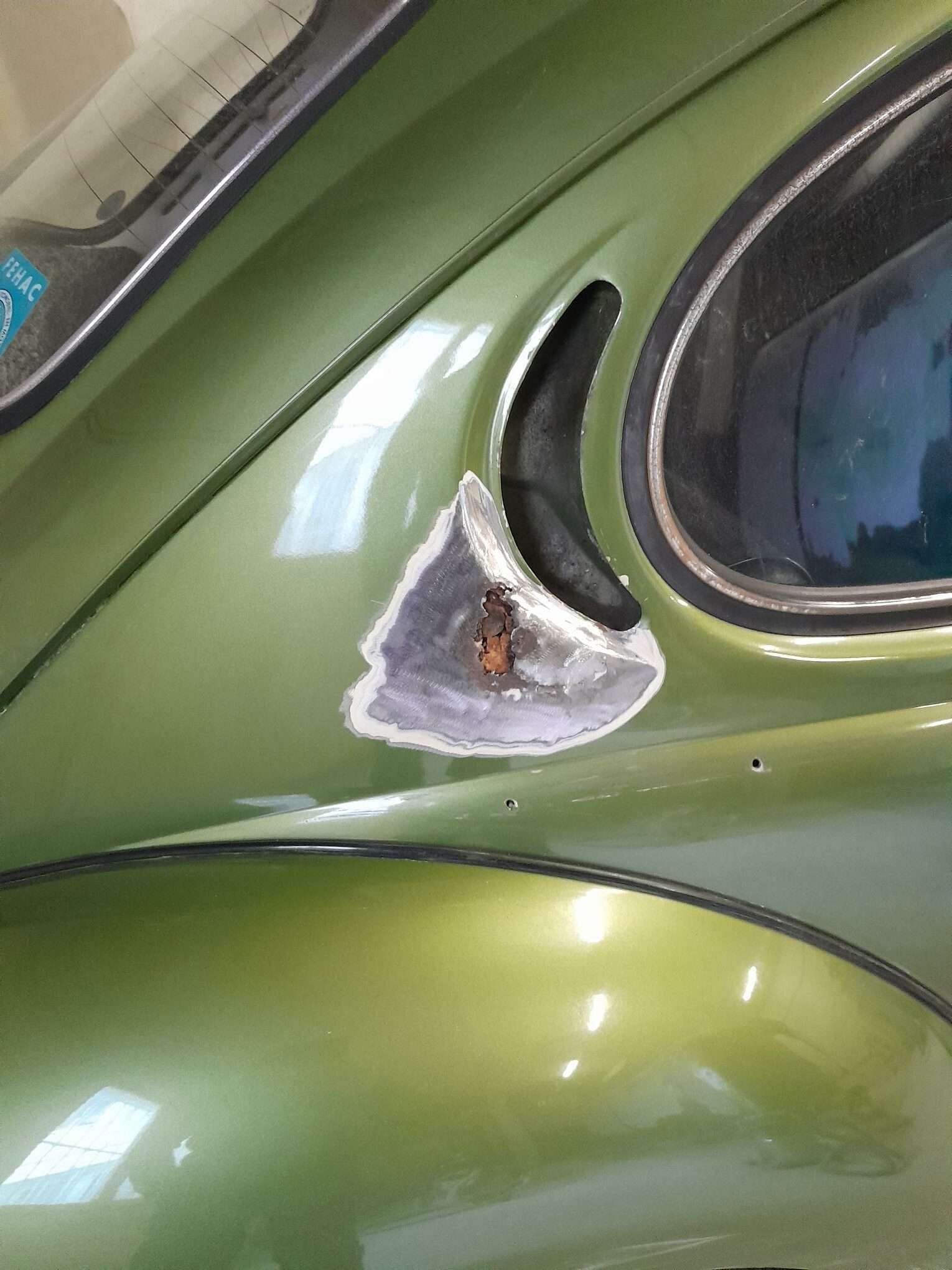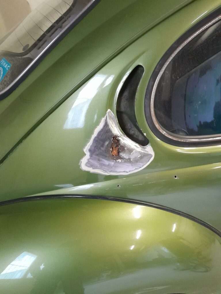 Coté carrosserie, un croissant de coccinelle sera réparé, découpe de la tôle malade pour en refabriquer une.