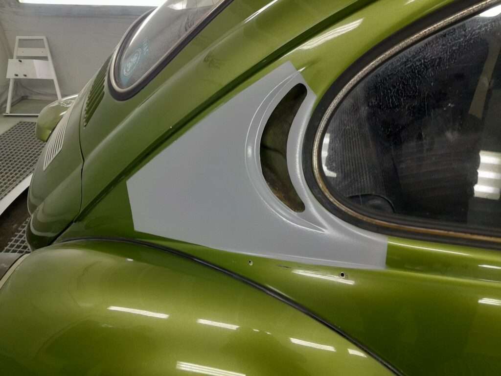 Une fois la tôlerie terminée, l’ensemble est mise en apprêt et le panneau lateral complet sera repeint.