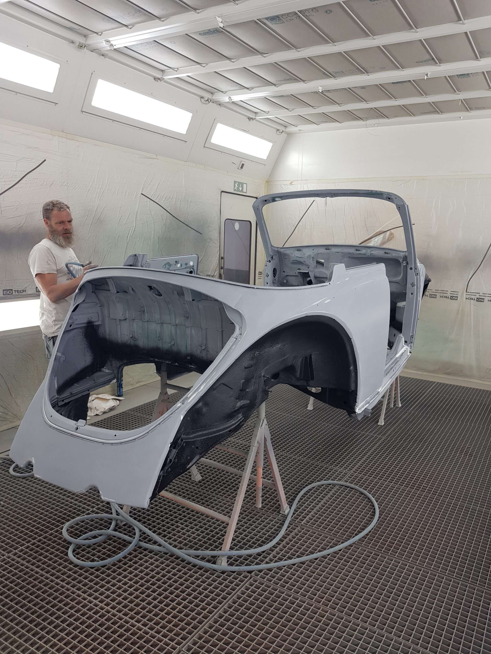 La caisse est en cabine afin de peaufiner les derniers défauts à la LUMIERE, tous les joints de caisse seront refait pour éviter les infiltration d’eau dans les endroits critiques et blaxonnage des passage des roues avant d’être peint pour éviter les éclats de gravillons.