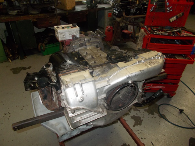 Sur le banc moteur, un moteur 2L type 4 est en assemblage avant un démarrage