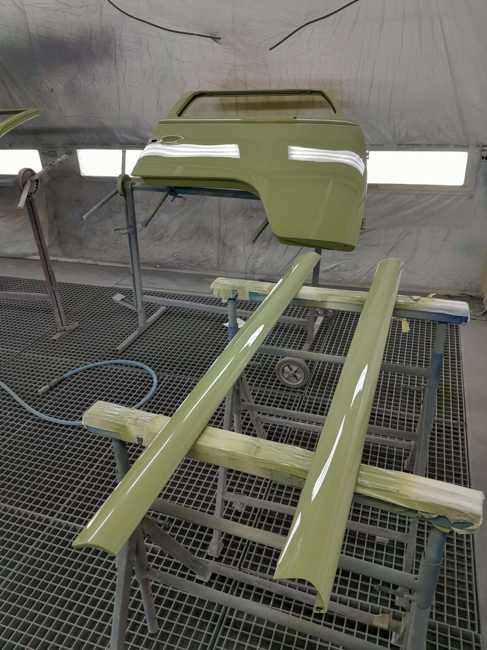 Julien, le carrossier s’est d’abord occupé des dessous avec un traitement antirouille de l’ensemble puis la projections d’un blaxon fin permettant de protéger les dessous même avec les projections de gravillons et l’ensemble a été repeint à sa couleur définitive pour une finition mieux qu’a l’origine.