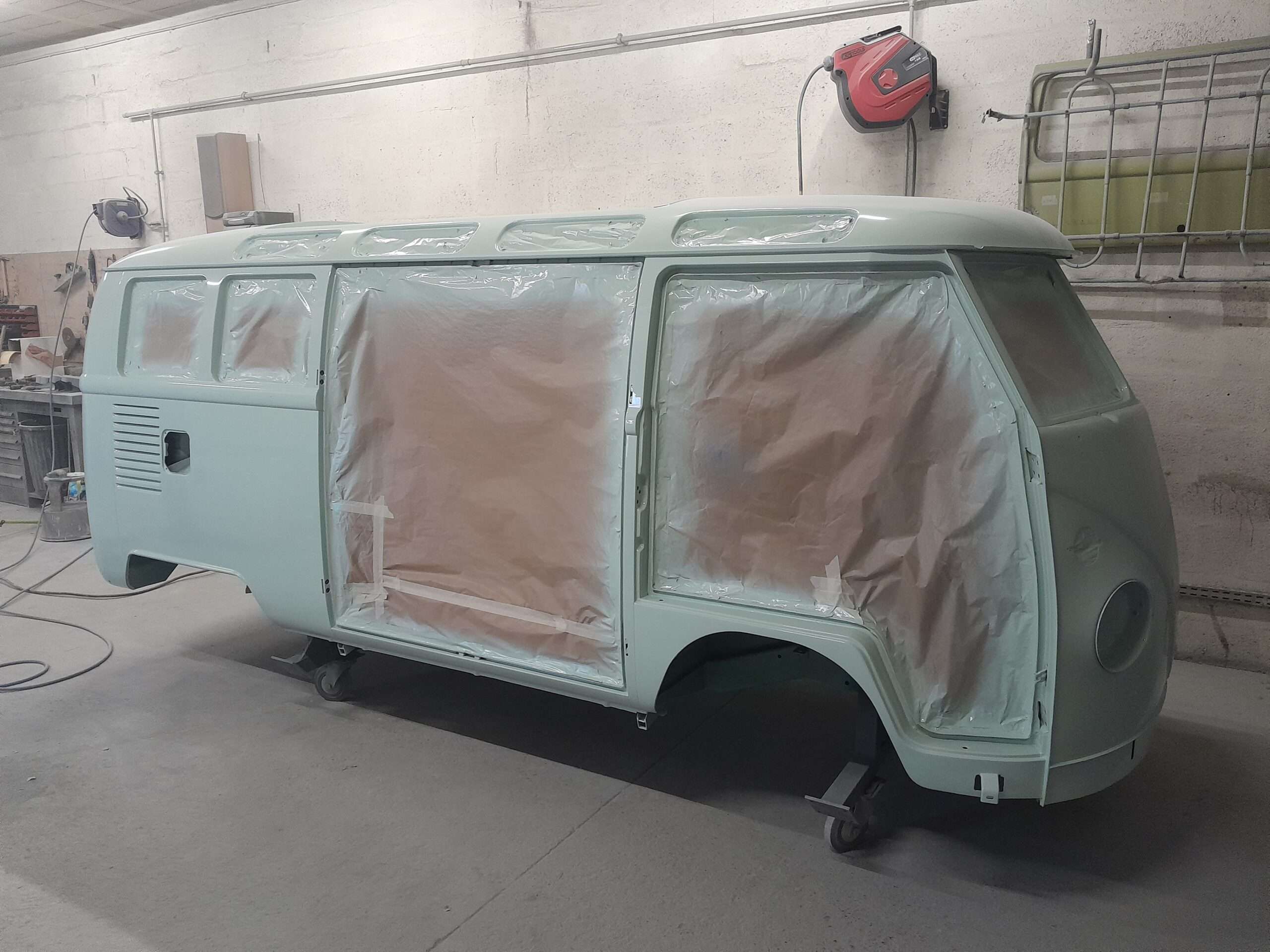 Ayant décidé d’avoir un super rendu une fois le vert cuit dans la cabine l’ensemble du combi blanc et vert sera intégralement dépoli afin de vernir l’ensemble et ainsi obtenir un rendu encore plus brillant. Bref il y a encore des heures à passer.