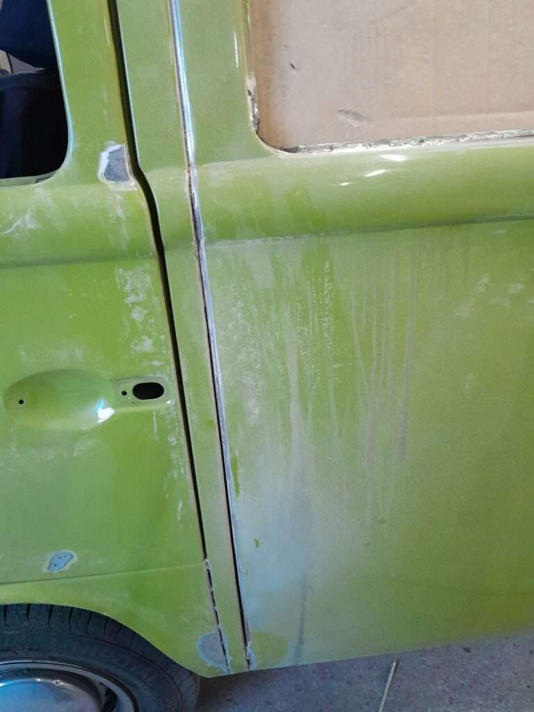 Suite a un sinistre avec un autre usager, le lateral gauche de ce T2 devra être repris en carrosserie mais malheureusement celui-ci a deja reçu des réparations pas forcement dans les règles.