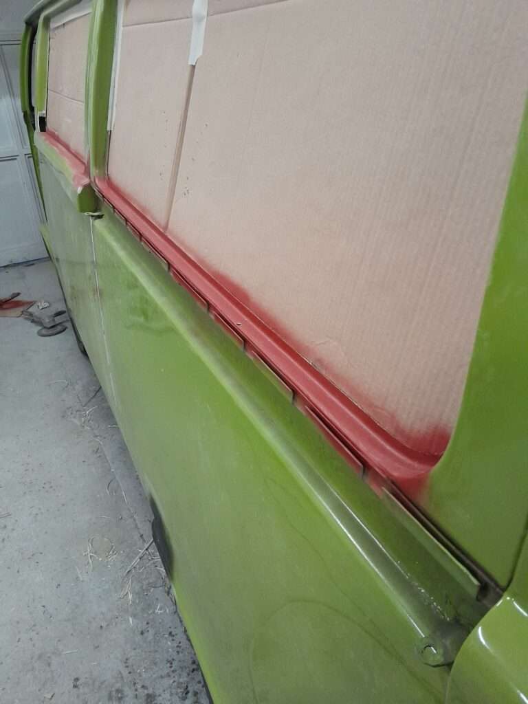 Le voici repeint raccordé en peinture, les remontage de la porte, des vitres et des pare choc débutent. Un travail de plus d’une semaine à temps complet.