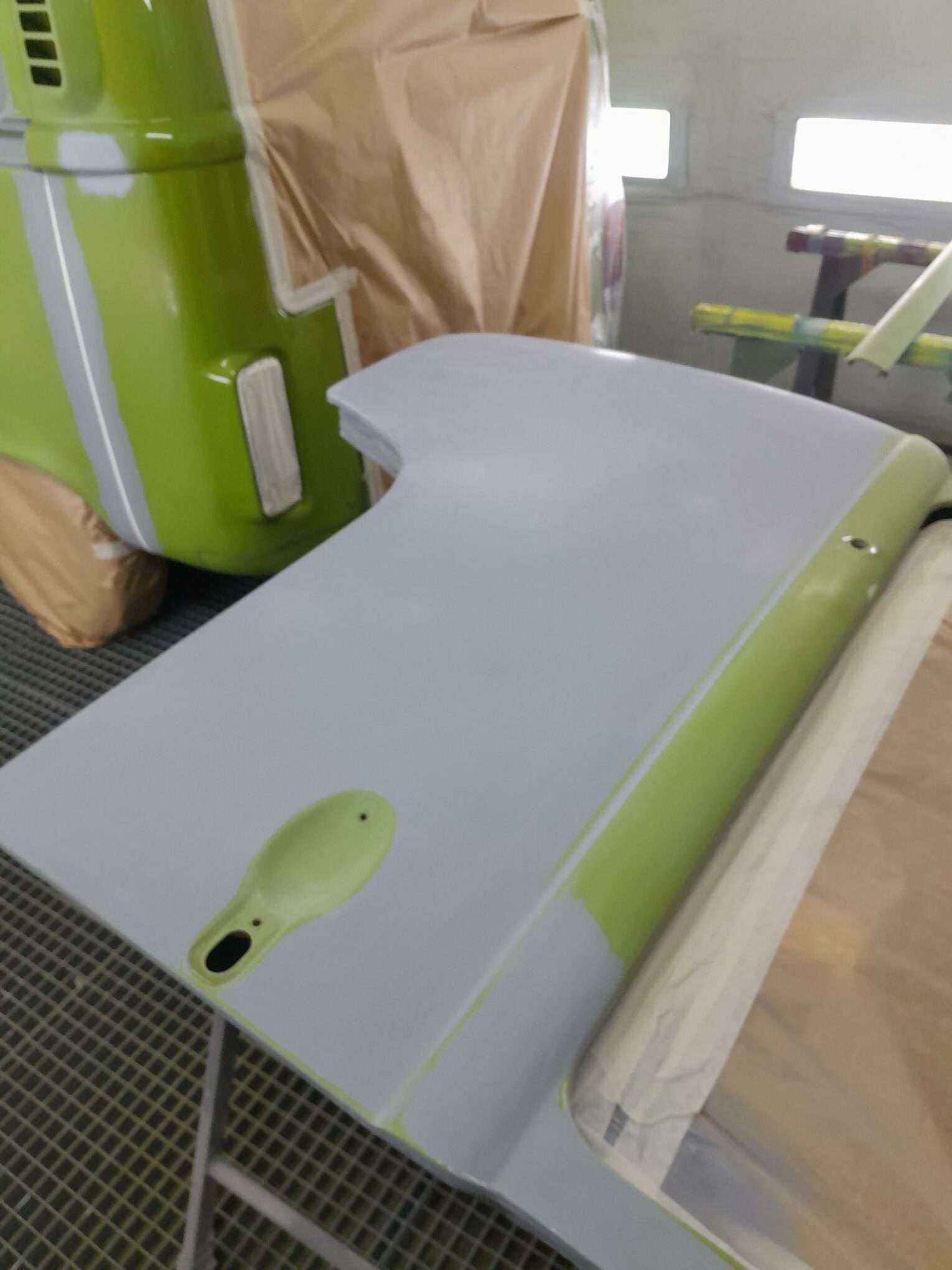 Le voici repeint raccordé en peinture, les remontage de la porte, des vitres et des pare choc débutent. Un travail de plus d’une semaine à temps complet.