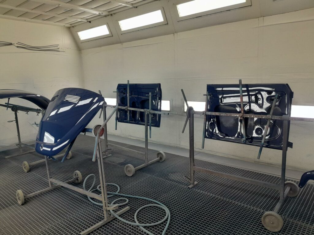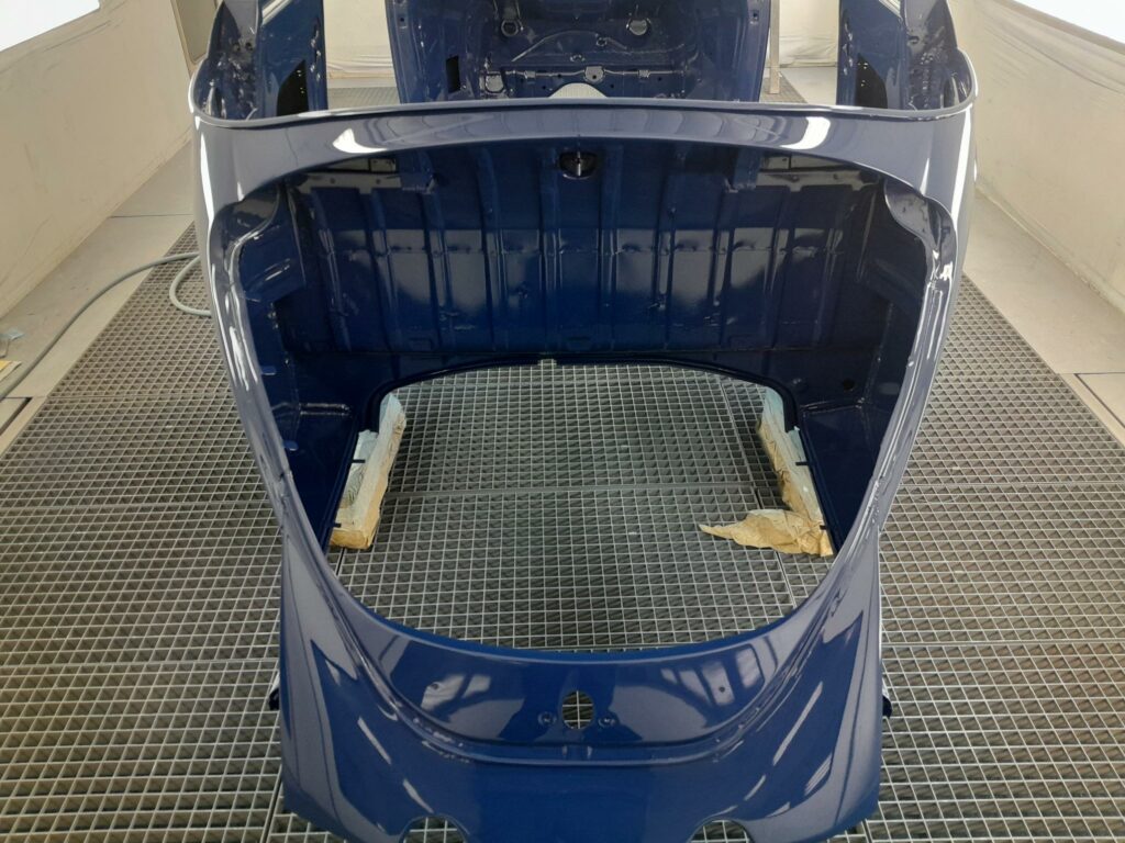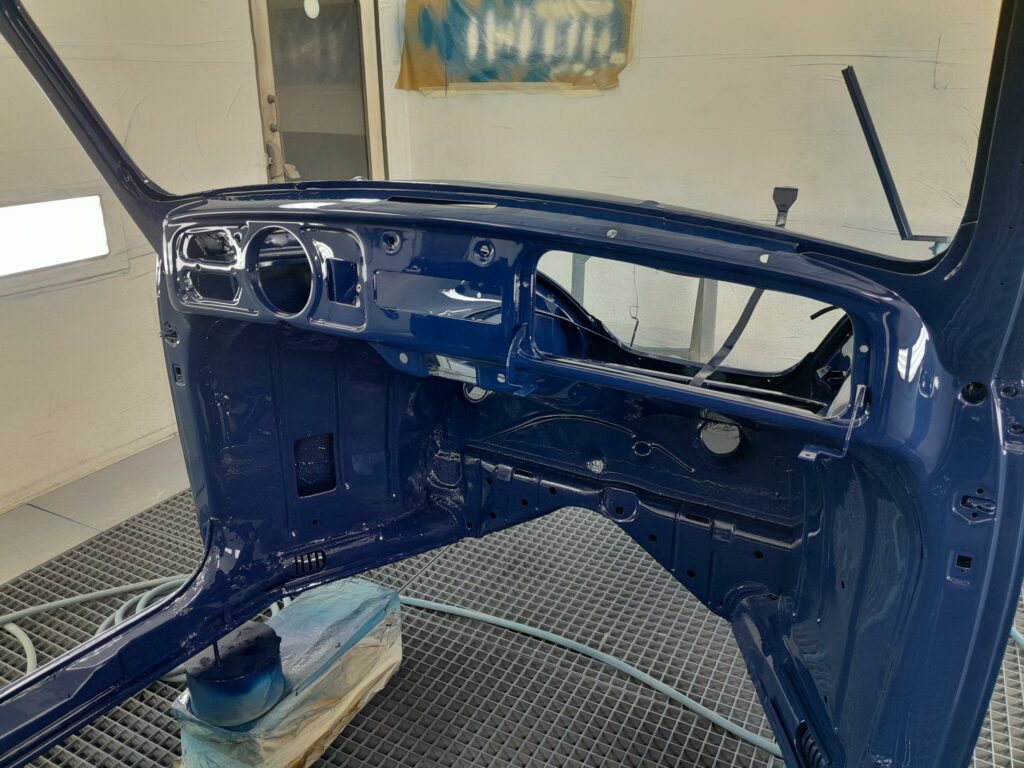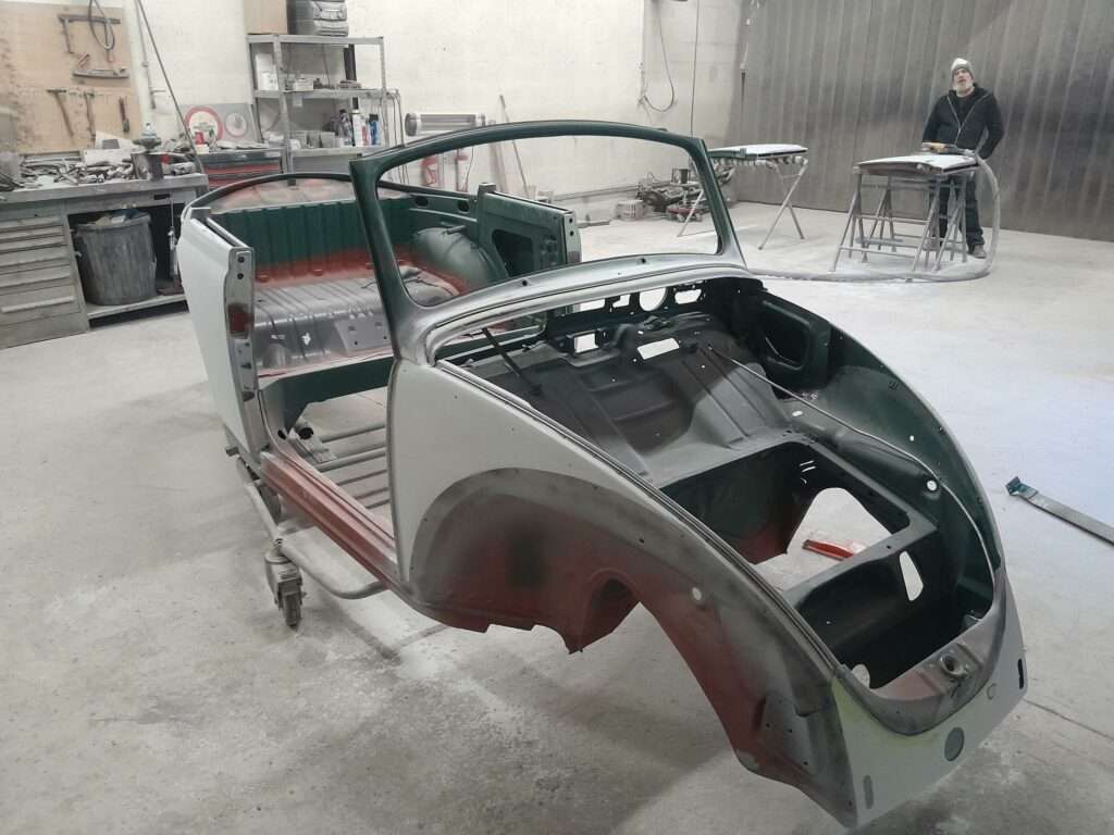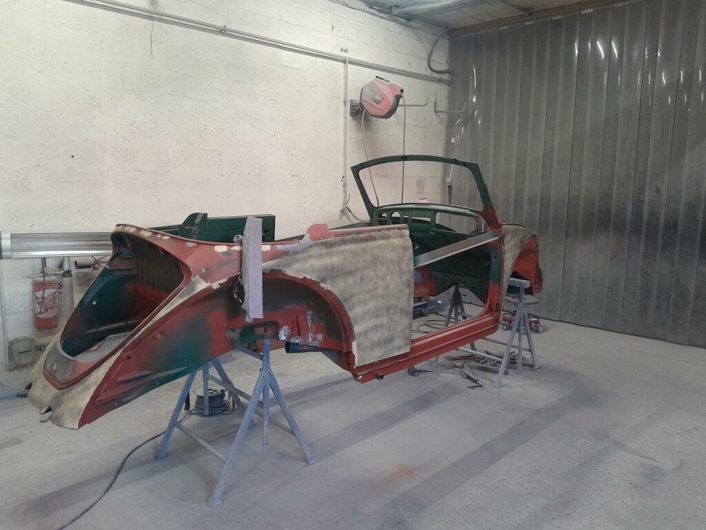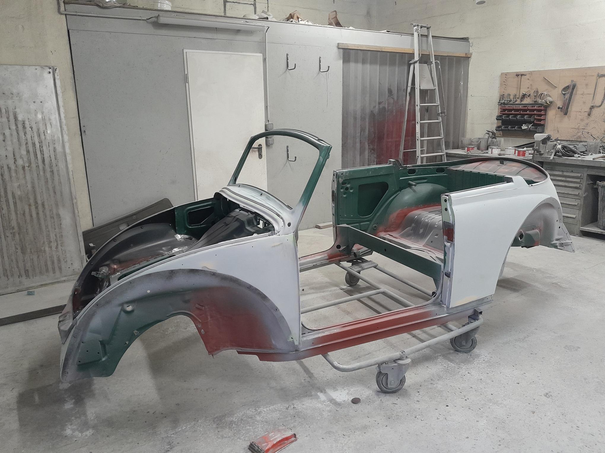 Une fois les soudures terminés, la caisse sera à nouveau décapée pour être redressée au tire clou puis traiter au brun rouge phosphatant. La caisse recoit un apprêt polyester.