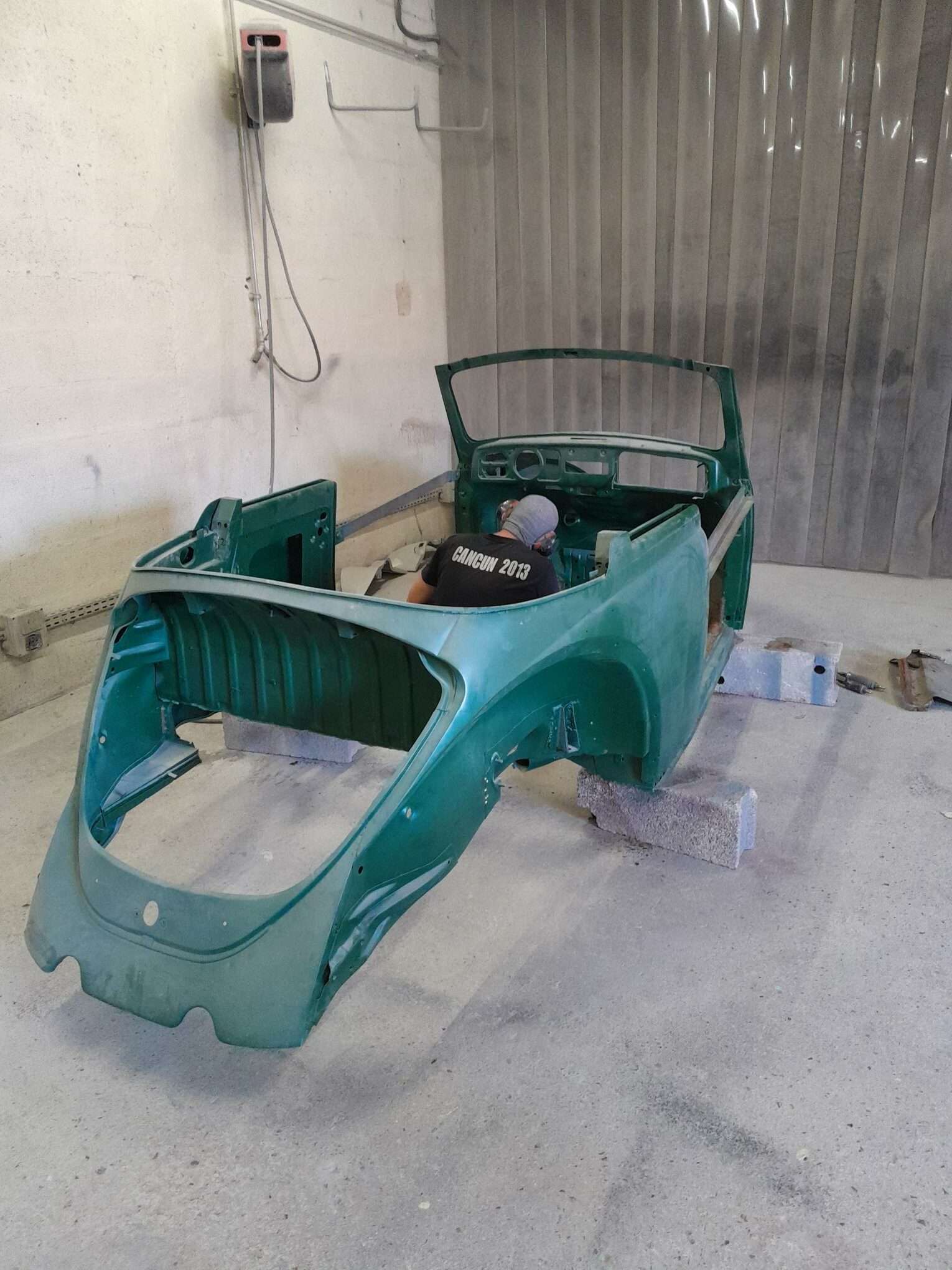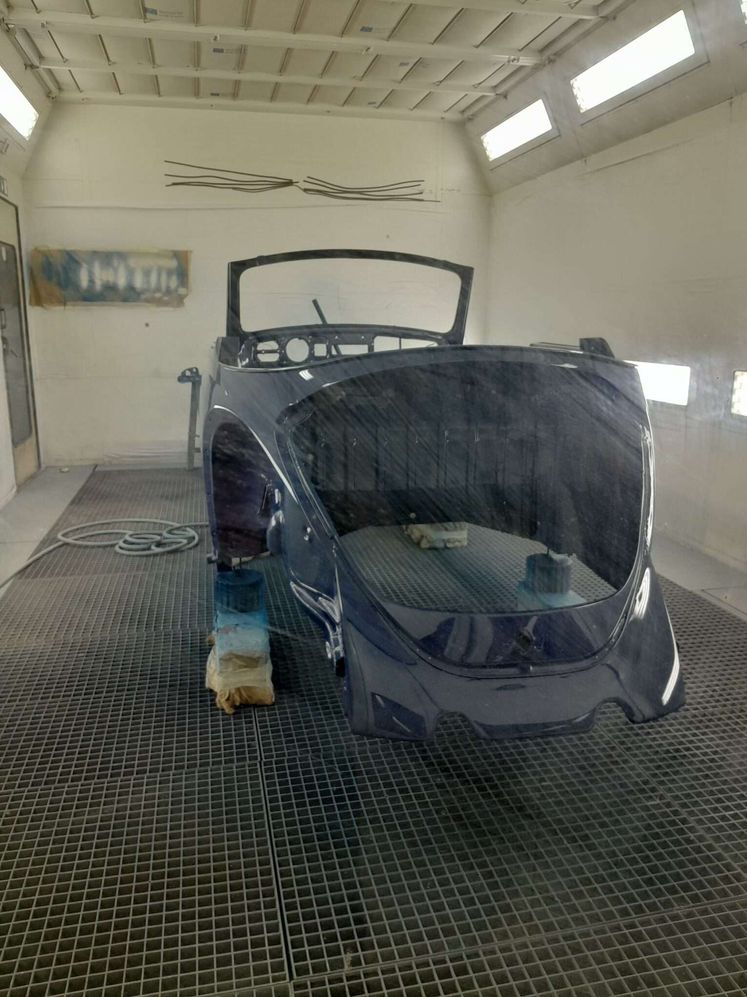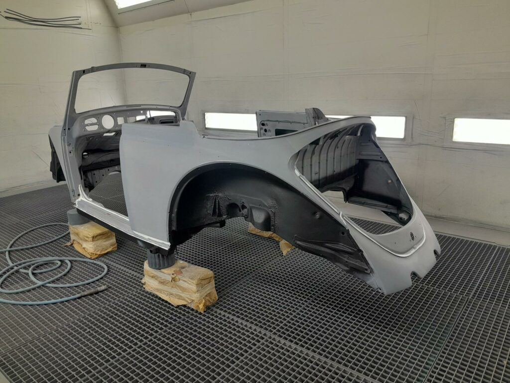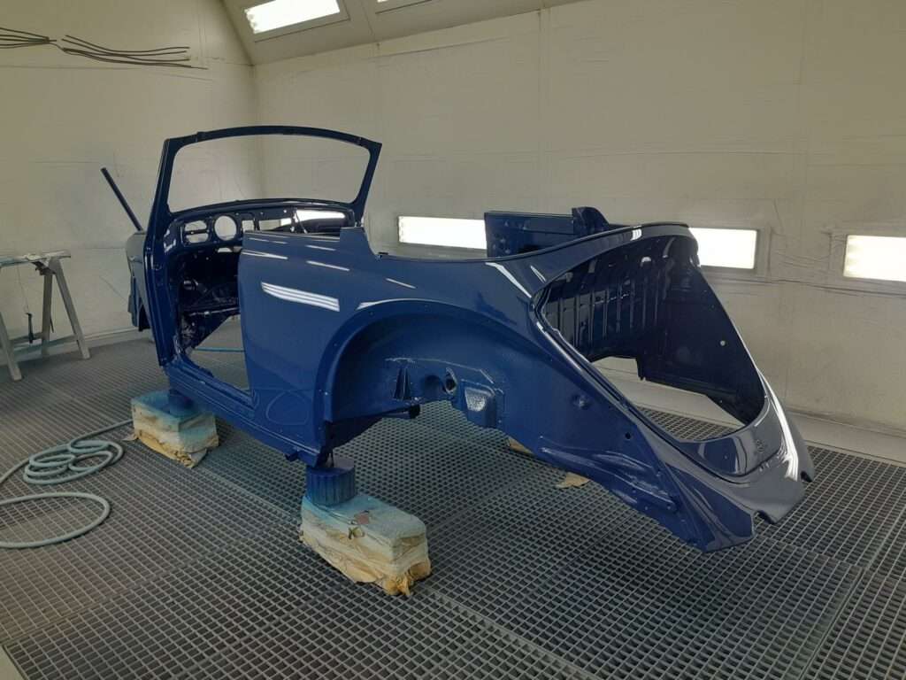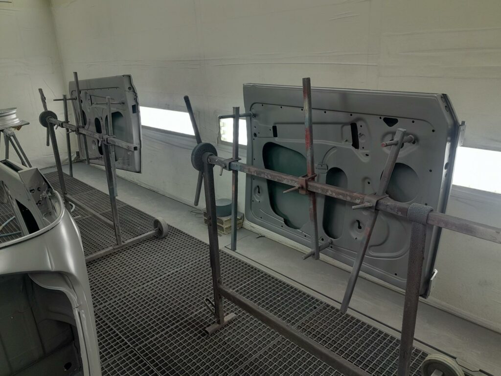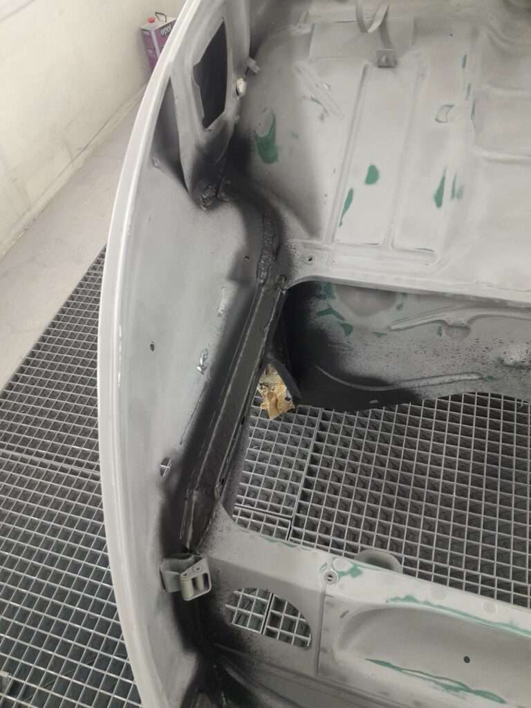 Une fois les soudures terminés, la caisse sera à nouveau décapée pour être redressée au tire clou puis traiter au brun rouge phosphatant. La caisse recoit un apprêt polyester.