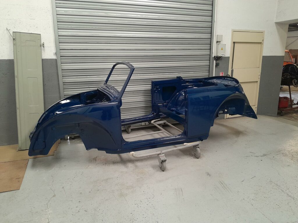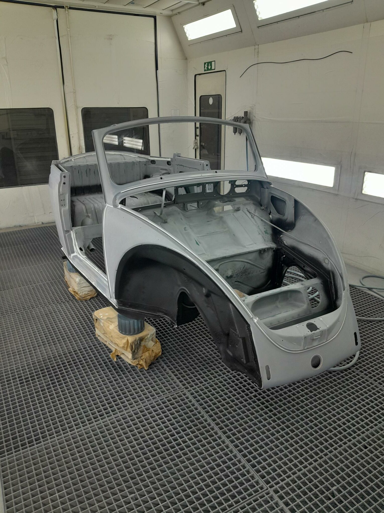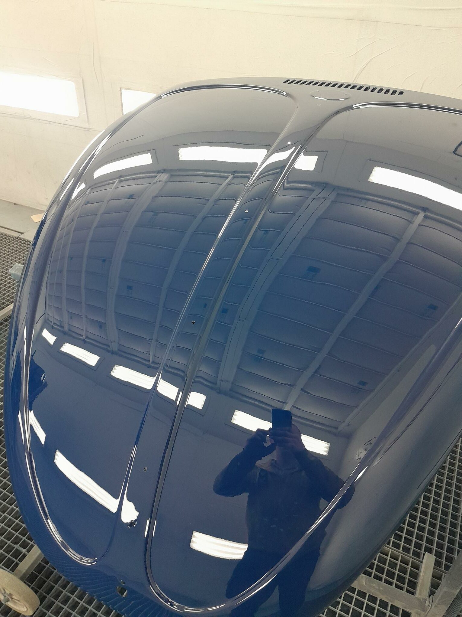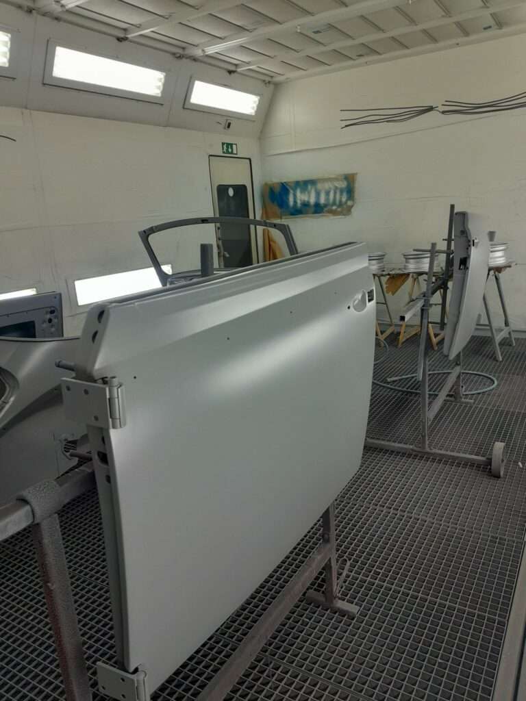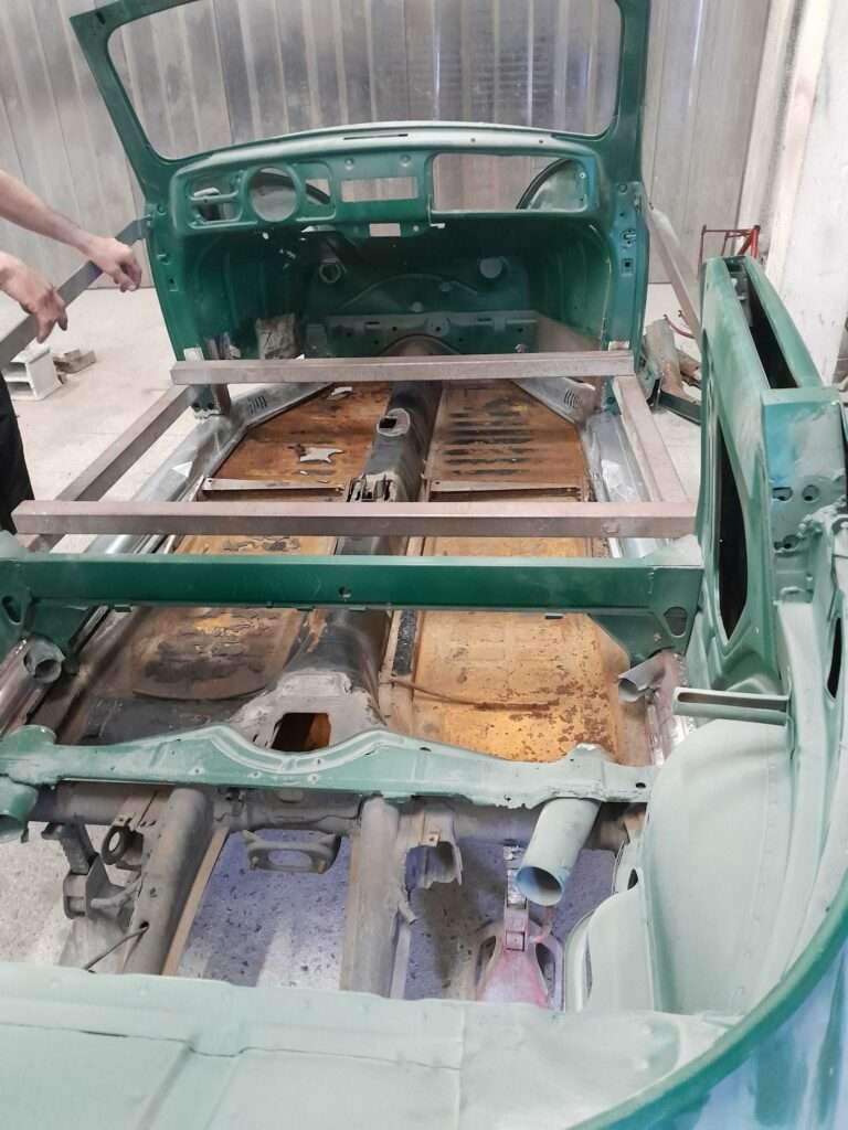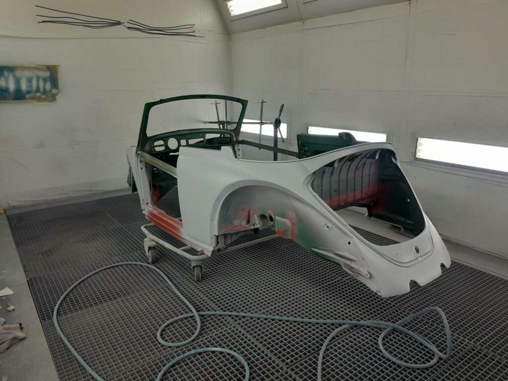 Une fois les soudures terminés, la caisse sera à nouveau décapée pour être redressée au tire clou puis traiter au brun rouge phosphatant. La caisse recoit un apprêt polyester.