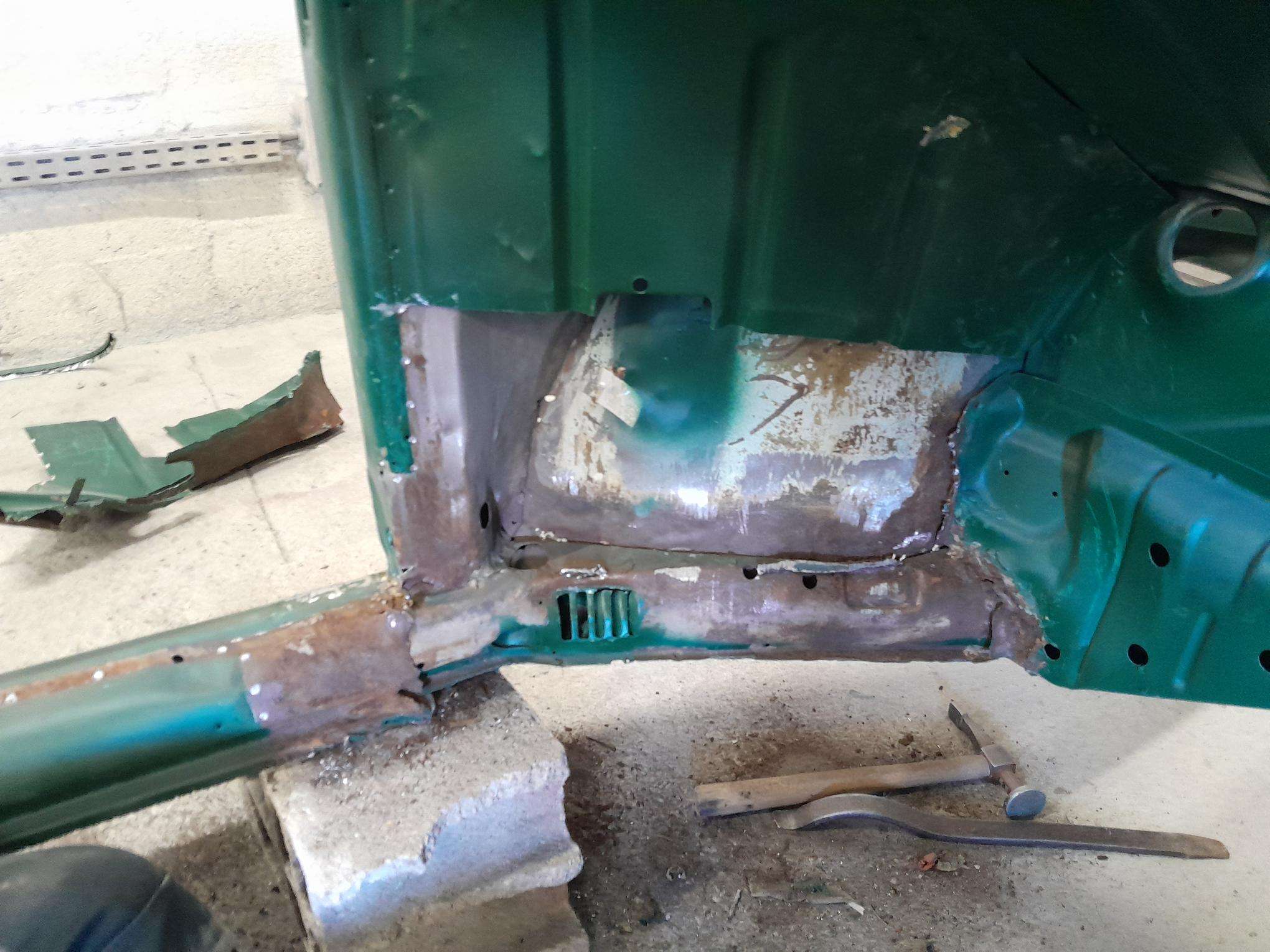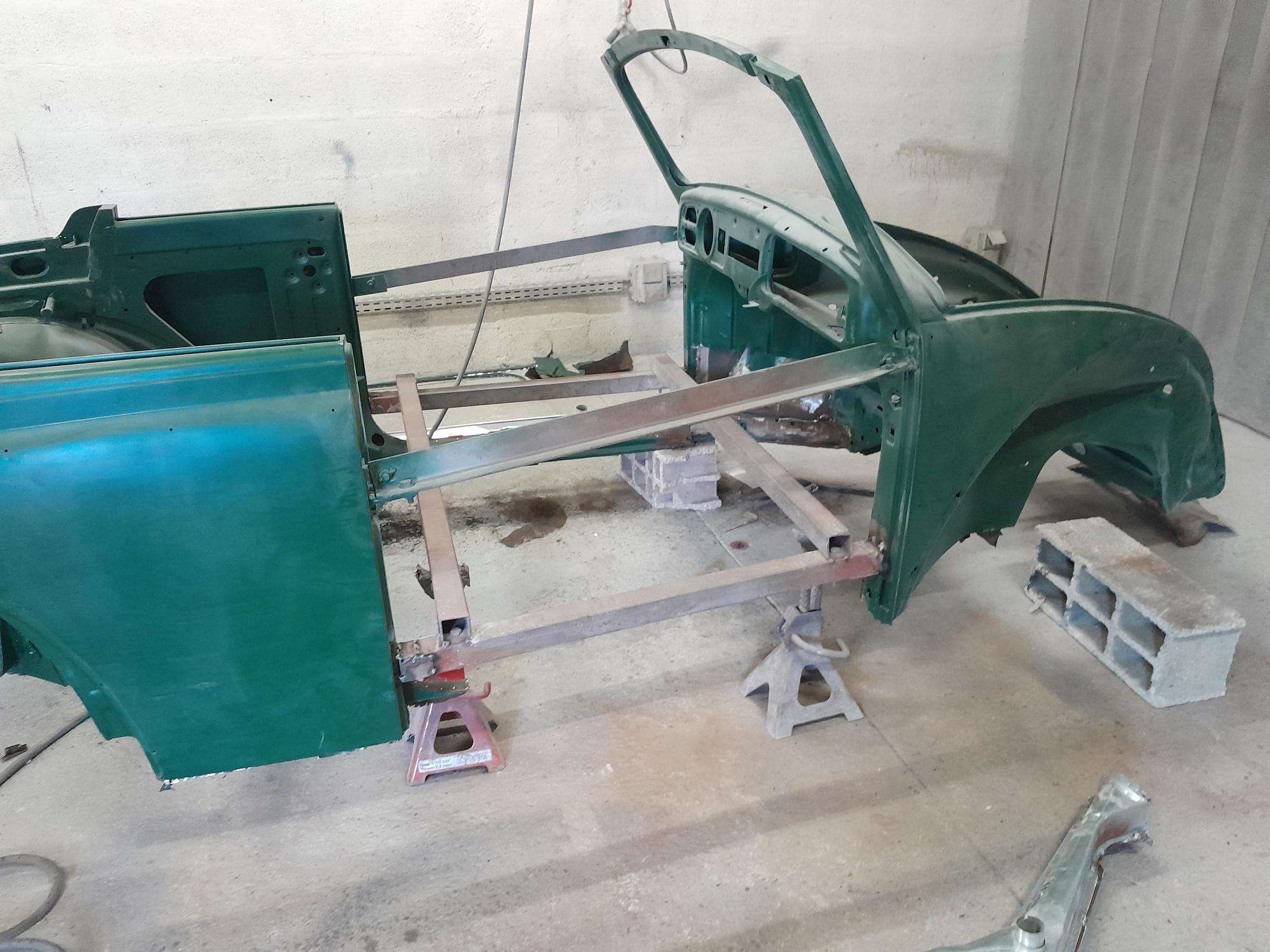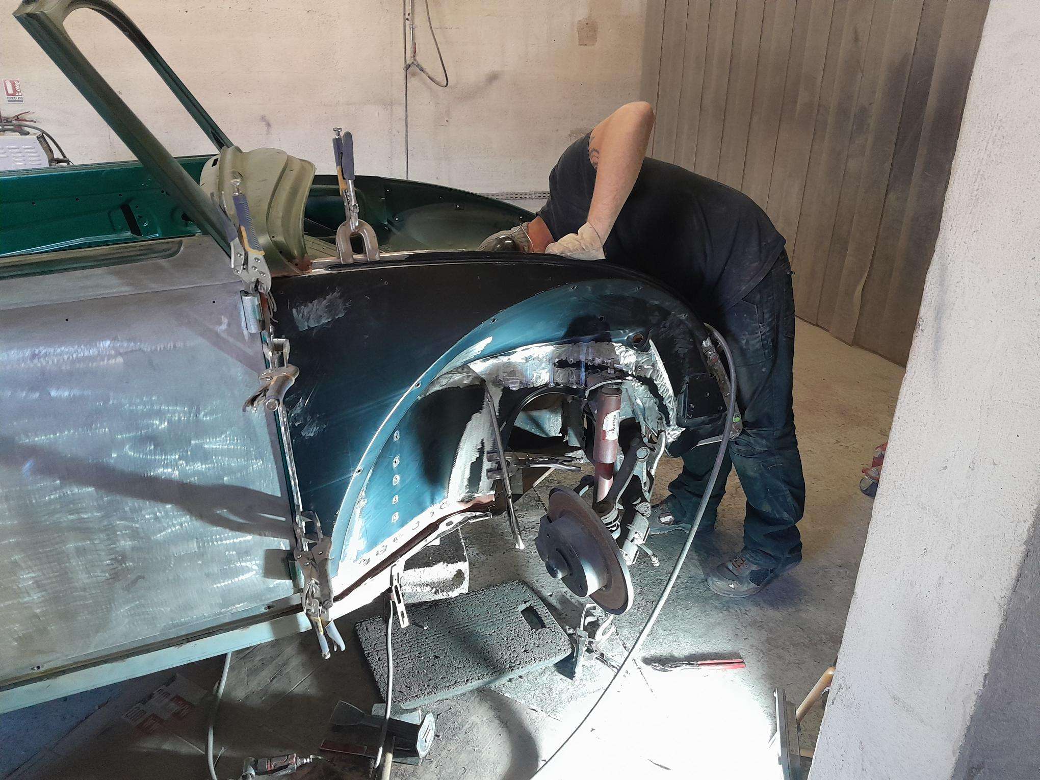 Les travaux se poursuivent sur le bloc arrière, remplacement de la tôle de coffre arrière, remplacement des pointes arrières et des supports de chassis.